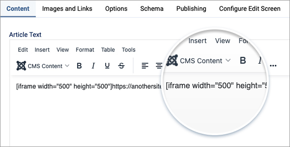 With Easy Shortcodes you can insert HTML elements that usually are not allowed by the editor like <iframe>, <script>, <link> and <style>. All done directly from the Joomla editor. Read more about these example use cases here.
